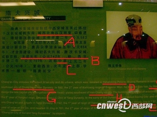 在介紹到隋朝歷史時(shí),展板上的文字說(shuō)明寫到:“Daxing City of the Sui Dynasty”(公元581-681)……”,且不論翻譯是否正確,這隋朝的滅亡時(shí)間怎么就從公元618年推遲到公元681年了?生生是讓隋朝遲亡了63年,而這時(shí),唐太宗李世民(公元598~649)都已經(jīng)死了。在另一處說(shuō)明中這樣寫道:“天顯元年(公元742年)……”,其一,“天顯”年號(hào)跟隋唐根本沒有任何關(guān)系,而應(yīng)該是遼太祖耶律阿保機(jī)的年號(hào);其二,742年應(yīng)該是“天寶元年”。
