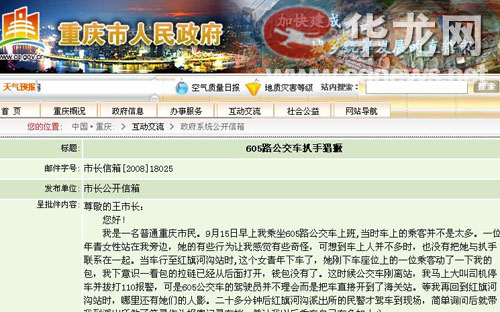 在605公交車上遭偷,求助司機又受冷遇,只好眼睜睜看著賊娃子脫身,重慶市民熊先生就遭遇了這樣無奈又憤怒的事情。氣憤之余,熊先生提筆向市長求助。今日,記者在重慶市政府信息網(wǎng)市長信箱上看到,該信箱公布了熊先生的訴求,有關(guān)部門也已著手解決了熊先生反映的尷尬之事。