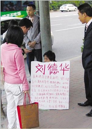 名為“YU-NO”的網友在自己的博客上張貼了兩張圖片。圖片中,一年輕男子手拿著想見劉德華的牌子。在牌子的正面上寫著“我是目前為止最傷心和想見劉德華的人……如果不是想見劉德華說不定我已經結婚了……因為沒見到劉德華,我任何人都不能打交道,別人都說我有神經病。我再這樣下去,早晚我媽媽都得被氣死……由于長期在外沒有什么錢。求過路人起點好心給我幾毛錢吃面包……你的大恩大德我今生都不會忘記,我愿意用我所做的錢一半給你,只為你幫幫我,我和劉德華不僅僅是見見一面而已。”