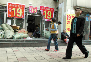 據(jù)附近一大廈保安稱,這個(gè)小店開業(yè)不到一個(gè)星期,天天掛著這樣的橫幅,門口的音響也重復(fù)放著“老板娘跑了,小老板哭了”的促銷廣告語,每天進(jìn)出的顧客很多。