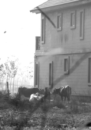 走到別墅區(qū)的中央,三頭牛正在別墅旁悠閑地吃草,繩子就拴在別墅的窗戶上。枯草、牛糞混雜在一起。“豪華別墅區(qū)成了牛欄!”一名路人見狀不無戲謔地大聲說。