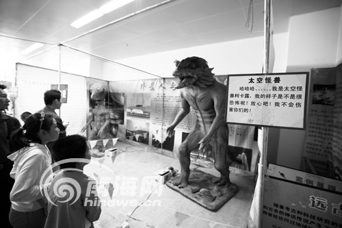 記者進入展館內看到,里面擺著一個個塑料制成的動物模型,接通電源,有人走過時模型會發出一些怪異的聲音。館內有“太空怪獸”等幾十個大小不一的“動物”,工作人員稱這就是“外星人”。