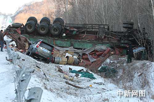 事故現場,一輛大貨車輪子超天側翻在路邊的深溝中,駕駛室嚴重扭曲變形,車上3人被困,路基下還有一輛長城吉普車,但該車體并沒有大礙,只是車內人員輕微受傷。在此高速公路段,由于這輛事故大貨車滑入路邊的溝中,后面的多輛車見狀立即采取緊急制動剎車,一輛載滿一車乘客的麒麟集團的大客車從下坡發現就開始制動,由于路面濕滑,大客車失控在路中來回擺動最終滑出200米橫在路中,車內乘客虛驚一場,所幸車內并沒有乘客受傷,這時另一輛大貨車從上坡下來看見大客車橫在路中,司機也立即采取制動,將車撞向路中的隔離護欄,避免了一起重特大事故發生,在該貨車的后面100米,還有兩輛轎車不程度受損。
