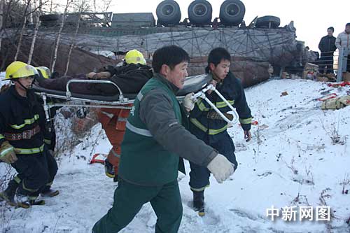 方正縣消防大隊的消防官兵立即趕到現場,使用液壓破拆工具立即對溝中變形的大貨車車體破拆,由于貨車車駕駛室已經被撞癟,駕駛員在什么位置都看不到,這給救援的消防戰士帶來很大困難,消防戰士從先后從車內狹小的空間救出2人。隨后,交警找來吊車將變形的車體吊起,消防戰士又使用破拆工具將變形的車體破拆開,此時駕駛員已被擠死在變形的車內。