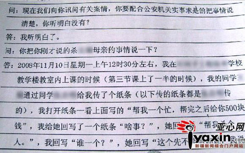 圖為警方審訊筆錄。內容顯示莎莎和亮亮用紙條商量殺害莎莎母親。