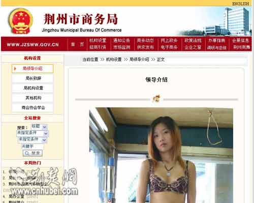 9時(shí)23分,記者登陸荊州市商務(wù)局的網(wǎng)站看到,局領(lǐng)導(dǎo)介紹一欄中,赫然變成了一名身著三點(diǎn)內(nèi)衣的性感女郎。而局長致辭則是“為女朋友慶生喝酒”的召集函。這兩個(gè)欄目是本周熱門,累計(jì)被點(diǎn)擊9000余次。9時(shí)28分,記者再登陸時(shí),該網(wǎng)站已無法正常打開。