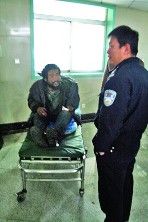 下午4點(diǎn),濟(jì)南市中心醫(yī)院急診大廳,一名滿臉胡子、衣著破舊的男子坐在擔(dān)架上。“我是來(lái)看病的,放開我”,雙腳還被繃帶束縛著的他搖頭晃腦,“我喝酒了,我做錯(cuò)了,我給你們磕頭”。
