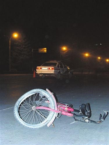 23時45分左右記者趕到事發(fā)現(xiàn)場時,幾名交警正在勘查現(xiàn)場。昏黃的路燈下,公路中間躺著遇難者;幾米遠處,是那輛輪胎已經(jīng)變形的自行車;距自行車10米遠的地方,停著一輛右側(cè)前燈處有嚴重“撞傷”痕跡的警用普通桑塔納轎車,警車車牌為“川Z0189警”。