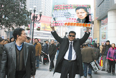 昨天下午4時許,記者在解放碑步行街看到,該男子舉著一塊長1米,寬0.5米的廣告牌在游走,衣著及外形模仿周潤發在電影《英雄本色》中扮演的“小馬哥”。牌子上大致內容是:“中國搖滾領袖舉辦搖滾音樂會,如果你想成名,請收購中國搖滾領袖頭銜,一千萬”。他以這身行頭出現引來上百人圍觀,甚至有市民以為在拍電影,上前與他握手。“他就是上次征千萬富婆的那個人。”部分市民認出了這名男子正是幾個月前曾在解放碑征千萬富婆結婚的“征婚狂人”廣西人毛杰東。毛先生表示,想憑自己酷似發哥的外形,通過征婚獲得資金發展搖滾事業,雖沒成功,但他熱愛搖滾的熱情還未減退,這次想在解放碑拍賣自己“搖滾領袖”的頭銜,也就是拍賣自己。如果有人愿意拿出1000萬或500萬來投資,他就可以組辦搖滾演唱會,并將繼續曾經的征婚路線,到各大城市宣傳自己,下一站將到成都。下午6時許,經保安人員多次勸解、警告,毛杰東才離開步行街。