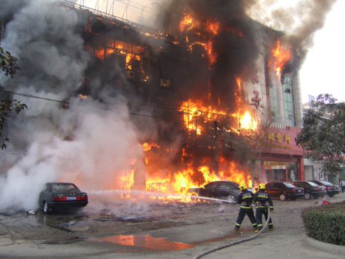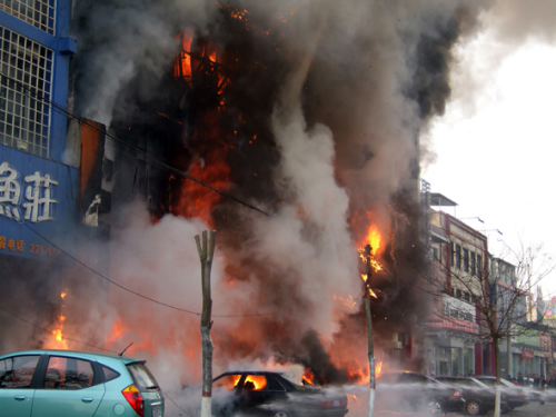 下午四點,記者從中銀大道鑫源福瑞特超市出來,發現北方有大量煙霧,順煙霧而去,在建設路口與消防車相遇,共同趕往事發地點。中銀大道已經圍滿了人群,著火的商店火勢猛烈,被燒碎的玻璃啪啪直往下掉,門前的汽車也著了,一輛為晉M89550的紅旗轎車已經燒的面目全非了。