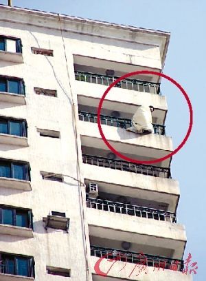“5時16分我們接到報警,5分鐘后我們趕到現場時,他已經爬上去了。”常平消防中隊的救援戰士介紹說,他們趕到現場時該男子的身體已經站在了陽臺外面,他用雙手抓著陽臺的欄桿,身上裹著一床白色的被子,身體還不停地搖擺。