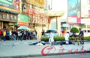 據目擊者講,當該男子從100多米高空跳下時,一老漢卻騎著自行車闖進了警戒區,正好被砸中,頭重重地摔在了旁邊花壇的石階上,血流不止。而跳樓的男子也當場氣絕身亡。隨后,120急救人員馬上將被砸中的男子送往醫院急救。昨晚6時50分許,記者趕到常平醫院重癥病房時,被砸中的老人已宣布不治身亡。