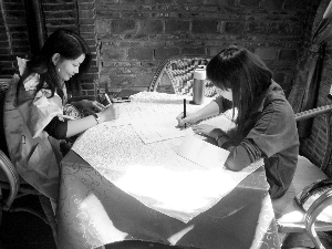 兩名報名參加富豪相親大會的女士正在填表。 信息時報記者 徐毅兒 攝