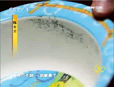 據(jù)董金獅介紹,調(diào)研小組利用日常生活中常用的電磁爐、帶蓋的不銹鋼鍋等器具和日常飲用的純凈水模擬實(shí)驗條件,對樣品進(jìn)行了耐濕熱性測試。“首先將樣品放在沸水中(保持沸水狀態(tài))煮30分鐘后撈出,在室溫中放置30分鐘后再放入沸水中(保持沸水狀態(tài))煮,此過程重復(fù)4次。在煮的過程中,發(fā)現(xiàn)部分樣品有裂紋、變形和發(fā)白現(xiàn)象,且釋放刺鼻、熏眼睛的氣味,”董金獅稱,“以家樂福銷售的由臺州市希爾家庭用品有限公司生產(chǎn)的綠色密胺碗為例,國家環(huán)保產(chǎn)品質(zhì)量監(jiān)督檢驗中心檢測為合格,但在此次模擬測試中卻發(fā)現(xiàn),樣品在第一次放在沸水中時就有明顯的發(fā)白現(xiàn)象,且時間越長,發(fā)白面積越大,同時釋放出刺鼻、嗆眼的氣味。從批發(fā)市場抽檢由北京佳美密胺制品有限公司生產(chǎn)的內(nèi)紅外黑密胺碗也是如此。”