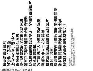 蘇小姐在南京棲霞區新港開發區一家公司做文職工作,25歲的她長期和電腦打交道,每天伏案上網最少十小時以上。近段時間,常常自述頭暈、目眩,肩頸部每天酸痛得很,右手有時拿著物品都會不自覺地掉落下來。去醫院檢查,被告知是頸椎長了骨刺并有韌帶鈣化,屬于頸椎病,需做綜合治療。前幾天,蘇小姐在網上看到一篇自翊為“山寨版治療頸椎病”的帖子,文字左右顛倒,需要上下左右不停地搖頭晃腦才能看清網上帖子的全部內容,從而起到治療頸椎病的作用。