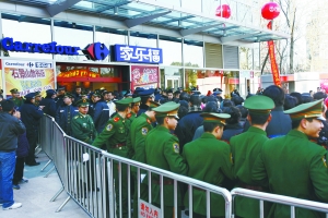 昨天上午10點(diǎn)左右,記者看到家樂福超市大門緊閉,門兩側(cè)各貼了一張解釋未能如期開張的告示。門前的圍欄里,一些工作人員正在向不斷趕到的顧客解釋關(guān)門原因。