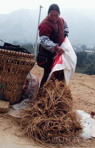 40多歲的魏永珍是任家坪村人,她麻利地將麻袋中還粘著泥土的當歸倒出來任人挑選,以1.5元/斤的價格賣出。這個價格,是去年同期他們賣給下鄉收購“小老板”的批發價。他們所在的地段,不斷有游客走過,走到北川老縣城外的“新三倒拐”看地震遺址,很多人會停下來買些當歸。屢次來此買過當歸的王師傅說,這里的當歸味道很正,有一種純正的甜味。魏永珍笑嘻嘻地說:“我們這里當歸好,路過的人都來買,生意多好!币换仡^,她指著遠處大面積的山說,地震已讓家園盡毀,原來用于種當歸的地都毀得差不多了:“本來可以產600斤左右,現在就剩了點邊角了,差不多只有100斤左右!