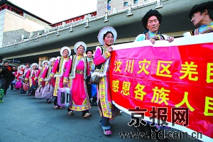 在排練基地,有26名穿著羌族服裝的演員非常引人注目,他們都是來自汶川、茂縣等地震重災區的村民,昨天中午1時剛剛抵達北京。