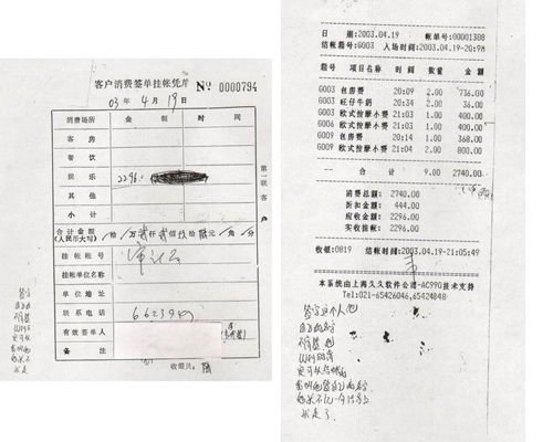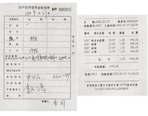結(jié)賬小票上列明的服務(wù)包括貴賓包房費(fèi)、鐘費(fèi)、加鐘、小費(fèi)、飲料等。第一次消費(fèi)的時(shí)間為2003年4月19日,入場時(shí)間為晚8點(diǎn)09分,結(jié)賬時(shí)間為晚9點(diǎn)05分。總消費(fèi)金額為2296元。其中,包房共計(jì)3間,費(fèi)用為1104元(368×3);歐式按摩小費(fèi)共有3筆,其中兩筆分別為400元,另一筆則標(biāo)明數(shù)量為2,金額為800元。另一份賬單的時(shí)間為2003年9月27日,入場時(shí)間為晚上8點(diǎn)03分,結(jié)賬時(shí)間為晚9點(diǎn)10分?傁M(fèi)金額為1498元。其中“貴賓包房費(fèi)”是498元,鐘費(fèi)是200元,加鐘是200元,小費(fèi)是600元。