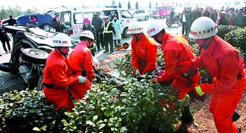 10多分鐘后,接警的消防戰(zhàn)士、解放軍163醫(yī)院的醫(yī)務(wù)人員、望城縣交警大隊(duì)的交警趕到了事故現(xiàn)場(chǎng)。消防戰(zhàn)士迅速用工具切割車(chē)體,將車(chē)內(nèi)傷員救出,醫(yī)務(wù)人員將傷員迅速送往醫(yī)院。由于節(jié)后返程的車(chē)輛大增,交通一度堵塞。交警迅速疏導(dǎo)交通,3名當(dāng)?shù)氐闹伟碴?duì)員也馬上投入到搶救傷員之中,一臺(tái)從岳陽(yáng)返回廣東的吉普車(chē)路過(guò),見(jiàn)此情景,一名警察也跳下車(chē)來(lái)幫助疏導(dǎo)交通,當(dāng)?shù)夭簧俅迕衽浜辖痪谑鹿尸F(xiàn)場(chǎng)設(shè)置警戒線……車(chē)禍現(xiàn)場(chǎng)雖然慘烈,但軍警民生死大營(yíng)救有條不紊地進(jìn)行。