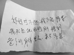 令崔女士怎么也沒有想到是,1月24日中午12點(diǎn)半左右,當(dāng)她從醫(yī)院回到家,卻發(fā)現(xiàn)自家的大門被反鎖了,“我只好從后院翻墻進(jìn)去,看到我女兒躺在床上一動不動,就像死了,旁邊有兩個安眠藥空瓶和一張遺書,上面寫著‘媽媽對不起,我不能陪你,我死后把我的肝移到爸爸的身體里去,救爸爸。’”崔女士頓時覺得天旋地轉(zhuǎn),“這兩瓶安眠藥有200粒啊!女兒是23日傍晚五點(diǎn)多在醫(yī)院吃過晚飯回家的,到我發(fā)現(xiàn)的時候,有十多個小時了。”
