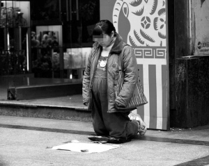 昨日,記者在某網站見到了這個名為《她騙取了人們的善意?》的帖子,發帖人“蕭二哥”附上了兩張照片。從照片可以看到,一名戴眼鏡穿藍色羽絨服的中年孕婦正跪在地上乞討,表情凝重。而令網友們詫異的是,該婦女穿的鞋子是一雙NIKE運動鞋。網友“贊”表示:乞討者的“裝備”越來越好了。
