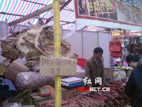 10日上午,網(wǎng)友“湘水悠悠”在紅網(wǎng)論壇發(fā)帖,稱在網(wǎng)上看到一個(gè)頗有調(diào)侃味的照片帖,標(biāo)題為《常德驚現(xiàn)最血腥警示牌》,帖子附帶一個(gè)疑似農(nóng)貿(mào)市場(chǎng)上商鋪的照片,在貨臺(tái)旁的柱子上掛著一個(gè)雷人警示牌“抓到小偷一刀砍死,自重”,還有紅網(wǎng)常德網(wǎng)友爆料稱在“年貨展銷會(huì)上親眼看見過(guò)”。