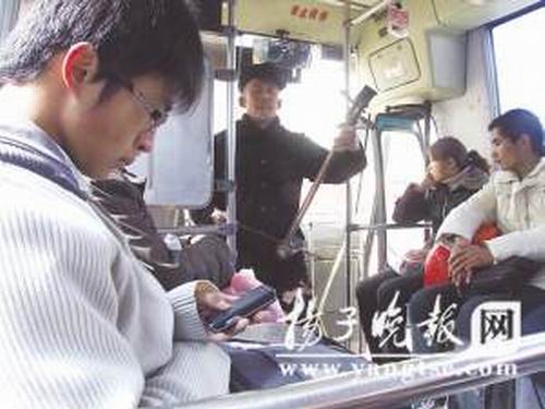 昨天下午1點(diǎn)多,在南京至浦口的一輛公交車上,車廂里突然飄蕩出胡琴聲,并伴隨著一陣蒼老的歌聲,引得車廂里乘客側(cè)目相看。這名唱歌者是一名老漢,年過六旬,一邊拉二胡,一邊唱歌。唱完幾首歌曲后,這名頗像流浪歌手的老漢,摘下頭上戴著的帽子,挨個座位向乘客收錢。有不少乘客解囊,掏出一兩塊硬幣投進(jìn)他的帽子里,也有乘客沒有理會,不愿意給錢。穿著整齊干凈的老漢,到乘客跟前討錢的時候,態(tài)度比較有禮貌,并沒有死纏硬磨乘客,在車上的15分鐘內(nèi),老漢演唱了3首歌,“賺”了20多元。