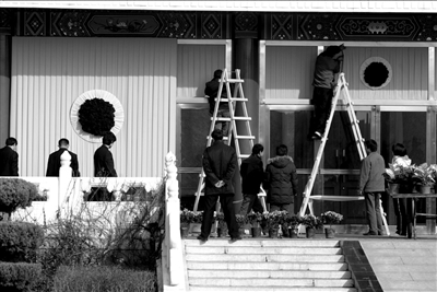 昨天,工作人員正在告別廳外進行布置。今天上午10時,在央視大火中犧牲的張建勇烈士遺體告別儀式將在八寶山殯儀館舉行。昨天,十多名身著制服的消防官兵整齊地進入殯儀館東禮堂內,布置送別禮堂。