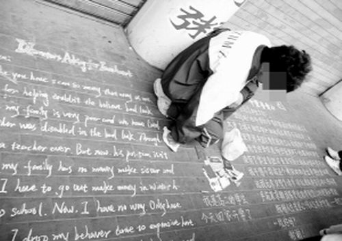 男孩的面前擺放著幾本“證件”和幾張零散的紙幣,在證件的前邊用藍色的粉筆寫著:“我是高二的學生,今天回家開學了!痹诘匕迳,他還用中文和英文兩種語言寫了“千里尋愛心”的求助信。