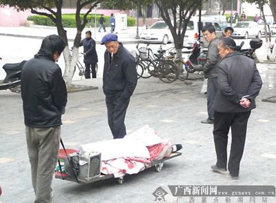 25日中午,一位靈川縣城的讀者致電本報桂林新聞熱線稱,她今天上午經(jīng)過靈川商貿(mào)城門口,看到一名年輕女子推著一架推車,上面躺著一具“尸體”。“尸體”用一床毯子嚴(yán)嚴(yán)實實地從頭包裹,只露出兩只腳。中午她再經(jīng)過那里時,發(fā)現(xiàn)推著“尸體”的變成了一個小伙子了。這種乞討方式太恐怖了,很多人繞道走,當(dāng)然也有人施舍錢。