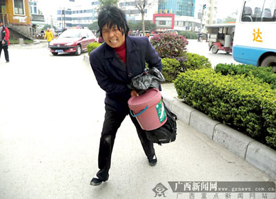 2月25日下午,在靈川縣商貿(mào)城門口,一名男子推著一具包裹得嚴(yán)嚴(yán)實實的“尸體”在討錢。當(dāng)記者提出要幫他找有關(guān)部門解決困難時,男子急忙“收攤”,拖著“尸體”離開。記者跟著他們,只見那具“尸體”忽然爬起來,抱著滿滿一桶討來的錢邁著矯健的步伐逃開。
