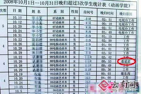 近日,北影校園內(nèi)張榜公布了各系晚歸宿舍的學(xué)生名單,有意思的是,學(xué)校竟然還把超過3次晚歸的詳細原因都公布了出來。昨天,有好事網(wǎng)友將這些名單傳到了網(wǎng)上。據(jù)記者觀察,學(xué)生們晚歸的理由五花八門,有“電視臺工作”、“吃飯”,也有“拍戲”、“回家”,而動畫學(xué)院一位女生的理由竟然是“看星星”!巴須w表格”一時間被無數(shù)網(wǎng)站轉(zhuǎn)載,點擊率一路攀升,而廣大網(wǎng)友的評論似乎也并不客氣。因為北影是藝術(shù)院校,加上娛樂圈給人的感覺是魚龍混雜,很多人的矛頭直指藝術(shù)院校學(xué)生的素質(zhì)。