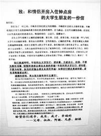 原公開信就貼在南京仙林大學城文苑路某高檔小區門口,信中告誡大學生不要“為了一時之歡,不顧養你們的親人的期盼,不顧給社會人才的榜樣形象,不顧給我們日常生活的影響,在居民小區內成雙成對地進出……”公開信還提醒提供日租房的小區業主“不要為蠅頭小利替他們愚蠢的沖動提供溫床了!”信件的落款是“盼望你們進步、成長、成才、幸福的父母、叔叔、阿姨、兄弟、姐妹。”