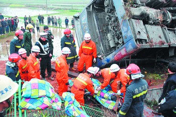 附近村民聞訊后,也紛紛趕來協(xié)助交警救人。但由于近來連續(xù)降雨,護(hù)坡非常濕滑,給救援工作帶來了極大困難。官兵們采用了救生繩施救的辦法,將兩根救生繩拴在護(hù)欄上,利用救生繩往路面運送擔(dān)架上的傷員。至上午8時30分,全部傷員被救出并送往醫(yī)院救治。11時40分,事故車輛被拖離出事地點,為實施救援而實行交通管制的京珠高速株洲段恢復(fù)正常通車。