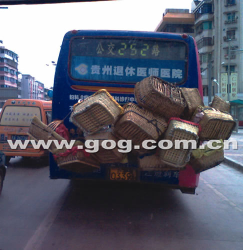 近日,有網友在貴陽論壇上稱,252路公交車是“貴陽最牛公交車”,因車頭車尾都掛著籮筐。