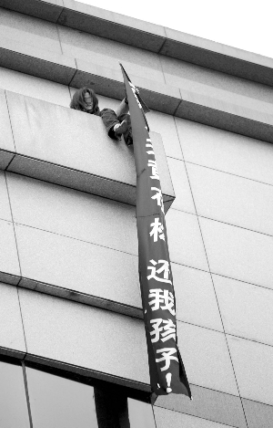 記者看到,一名身穿紅色外套的年輕女子,正坐在樓頂外墻伸出的一小塊天臺邊緣,垂著頭發,兩腳懸空,一只手抓著手機,另一只手拉著一條條幅,上面寫著“還我孩子”等幾個白色大字。圍觀的人越來越多,記者回頭望去,只見淮海路一側的自行車道上,整片黑壓壓的腦袋。