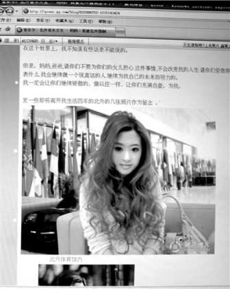 3月16日凌晨2點(diǎn)57分,“北外香水女生”發(fā)表題為《媽媽:我被北外強(qiáng)制退學(xué)了》的文章。該文稱,德語(yǔ)系劉老師找她談話,說(shuō)她的博客直接攻擊教育部,給學(xué)校領(lǐng)導(dǎo)造成很大的壓力,催她寫(xiě)退學(xué)申請(qǐng)。校方要求其家長(zhǎng)迅速抵京辦理手續(xù)。