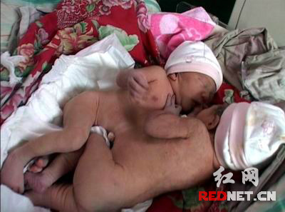 據悉,這對連體嬰兒的母親是新化縣石沖口鎮紅寨村28歲的段曉艷,在懷孕期間并未感到異常,5個月、8個月做B超顯示都為雙胞胎。3月16日8時許,她在新化縣中醫院婦產科經過一個小時的剖腹產手術,分娩出一對連體女嬰。兩女嬰從腹部粘連在一起,出生時兩女嬰共一根臍帶。目前,母、嬰身體狀況良好。