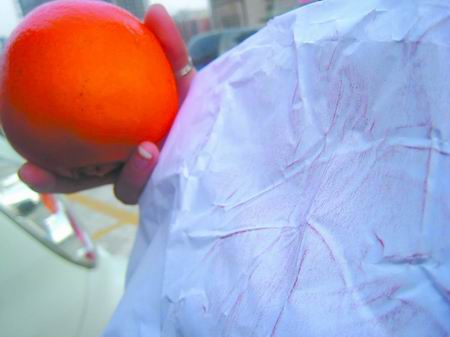 昨日下午,記者來到東韓寨,在一個攤位上買了4個顏色看起來偏紅的橙子。用白紙擦拭,果然發現白紙被染成粉紅色。記者詢問原因,商販稱在皮上涂了一些食用色素,“沒事,大家都這么涂的”。
