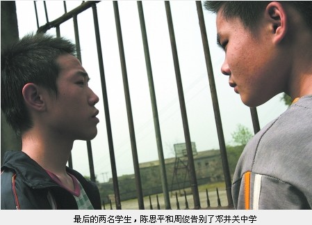 3月22日,陳思平和周俊,鄧井關中學的最后兩名學生,在學校門前站立半晌后轉身離去。這個讀了三年的學校從此不屬于他們。教育部門給他們聯系到一所職業中學就讀。十天前,富順縣鄧井關中學因“14名教師教2名學生”的狀況而名聞一時,被網友戲稱為“史上最牛中學”。最后的兩名學生終于走了,鄧井關中學在為眾人所知后,悄然謝幕。