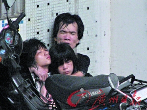 當(dāng)三輪摩托車開到城東派出所門前,杜某民嫌車速太慢,叫司機(jī)開摩托車進(jìn)入城東派出所院內(nèi)。下車后,杜某民用小刀架在小李的脖子上,用手扣住小袁的脖子(見圖),大聲叫喊:“有人殺人了,快報案”,然后把小李、小袁兩人推到城東派出所飯?zhí)靡唤锹,又叫:“把所有公安都叫出來。?/p>