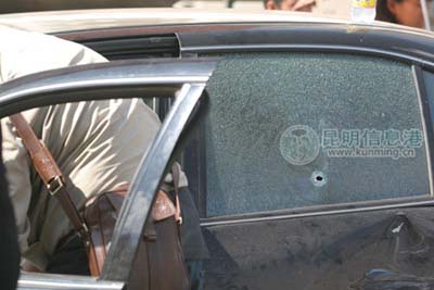 黑色尼桑車上的司乘人員已不知去向。記者注意到,尼桑車后車窗上有一圓形小孔,小孔四周的玻璃出現像蛛網一樣的大面積裂痕,很像子彈穿過的痕跡。有一名戴白色手套的男子在車周圍進行檢查,并以警方正在辦案為由拒絕接受記者采訪。