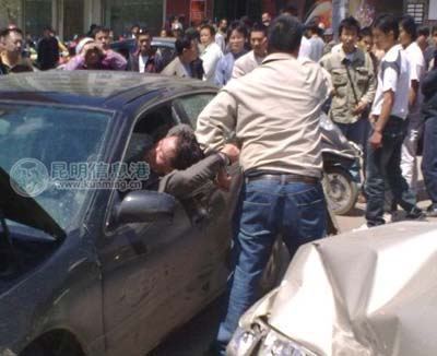 記者在附近找到了不少目擊現場的群眾,大家均表示在車禍發生后聽到了兩聲巨響!笆掳l時大概在下午1點45左右,一輛銀灰色夏利車在北辰大道由東向西行駛,到路口時突然有一輛黑色尼桑車以很快的速度迎面沖上去,將銀灰色夏利車撞得轉了個向!睋掳l當時在路口值勤的交通協管員陳先生介紹,黑色夏利車逆行撞上夏利車后,后面追上來的藍色大眾商務車也避讓不及撞到了黑色尼桑車上。(作者:黃凱 )(昆明信息港)