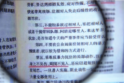 據(jù)悉,2006年,海淀城管分隊(duì)副隊(duì)長(zhǎng)李志強(qiáng)執(zhí)法時(shí)被小販崔英杰刺死后,北京城管對(duì)隊(duì)員進(jìn)行了如何防止暴力抗法的培訓(xùn)。在一次針對(duì)科級(jí)以上(含副科級(jí))人員的培訓(xùn)班上,曾使用過(guò)這本教材。但很快有城管隊(duì)員發(fā)現(xiàn)教材的用詞有問(wèn)題,并對(duì)此提出了質(zhì)疑。此后,這本教材就再未使用過(guò)。