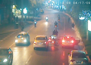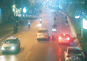 從回放的錄像中,記者清楚地看到,在非機動車道上,違章停放的尼桑車前方幾米處,曾出現過一輛淺色私家車。該車剛停下不久,騎車人的身影就出現在了畫面中,只見右后側車門先打開,有個大約六七歲的長發小女孩下了車。幾乎與此同時,左后側車門也毫無預警地打開了,正巧刮擦到了猝不及防的助動車,騎車人瞬間倒地,瞬間的突發情況以致后續緊跟著的頤達車盡管慢速行駛卻也根本無法避讓,硬生生壓過騎車人。