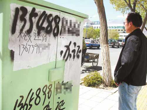 住在娘熱路附近的卓女士告訴,一些涂寫非法小廣告的人都是趁天黑或早上人比較少的時候伺機作案。他們這些人就是和管理部門‘打游擊’,很難被抓住。”卓女士告訴記者,拉薩是自治區(qū)的首府城市,而娘熱路是我市的一條主要干道,違法分子到處亂涂亂寫非法廣告嚴重影響了市容市貌,出售“槍支迷藥”的非法小廣告出現(xiàn)在城市中心地帶更會讓內(nèi)地游客擔心拉薩的社會治安,從而給拉薩的經(jīng)濟社會發(fā)展帶來不小危害,希望有關(guān)部門進一步加大工作力度,狠狠打擊這些違法分子。