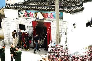 “愛(ài)紅棋牌室”西側(cè)緊挨古運(yùn)河,在一條名為“缺口河?xùn)|小街”的巷子的最里面。記者在現(xiàn)場(chǎng)看到,“愛(ài)紅棋牌室”東、南、北3面道路周?chē)急痪接?至3道警戒線(xiàn)封鎖,大量警力在現(xiàn)場(chǎng)維持秩序。由于圍觀群眾太多,躍進(jìn)橋上的警戒線(xiàn)出現(xiàn)了多次被人潮擠斷的情況,民警及時(shí)進(jìn)行修復(fù)和更換。