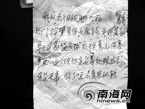 楊警官要求蔡某寫下一張收條,蔡某當場寫道:我以老鄉朋友身份為楊警官上門探望受傷女服務員,并找其領導上司商談妥協處理意外傷害事宜,由雙方協定妥善處理達到平安無事,收了一點小意思的錢。