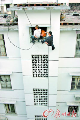 昨日下午,一名男子在佛山市禪城區嶺南大道一居民樓威脅要跳樓,佛山市、區兩級公安機關及消防部門經勸說未果后,采取行動,兩名特警從天而降,滑至窗口位置將該男子牢牢控制住,聯合消防隊員一起強行將其救下。